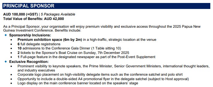 The Papua New Guinea Chamber of Resources and Energy is pleased to offer your organisation a range of sponsorship opportunities at the 2025 Papua New Guinea Investment Conference.