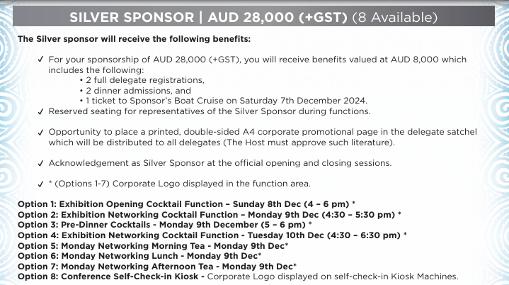 Important Note: Any additional banners or promotional materials not specified in the package will be at the sponsor's expense. Custom proposals must be approved by the Host.