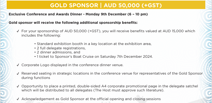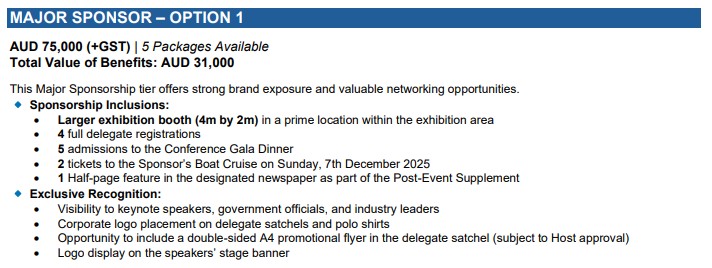 Aligning your brand with this prestigious event offers exceptional exposure and strategic value. Our sponsorship packages are tailored to meet a variety of corporate objectives and include the following tiers: Principal, Major, Diamond, Gold, Platinum, Silver, Bronze, and Nickel.
