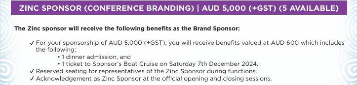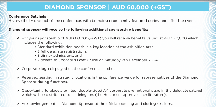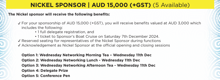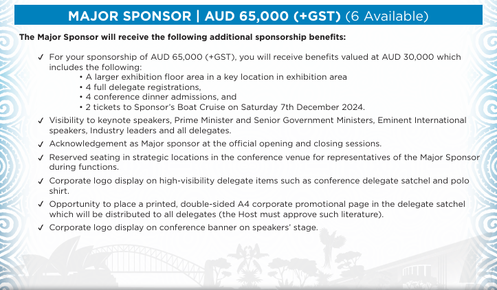 Aligning your company with this prestigious industry event provides exceptional value for your investment. Our specially designed sponsorship packages offer a solution to suit every corporate objective. The 2024 Sponsorship Packages include Principal, Major, Diamond, Gold, Platinum, Silver, Bronze, Nickel, and Zinc.