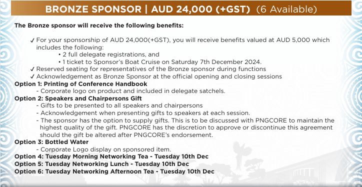 The Papua New Guinea Chamber of Resources and Energy is pleased to offer your organisation a range of sponsorship opportunities at the 2024 Papua New Guinea Investment Conference.