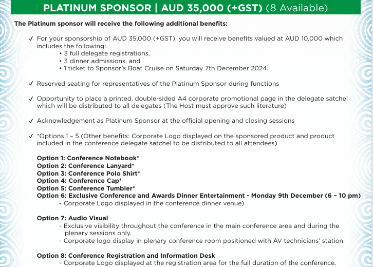 Important Note: Conference banners and other publicity not mentioned in the packages will be at the sponsor’s cost. Any additional proposals must be discussed with and approved by the Chamber.